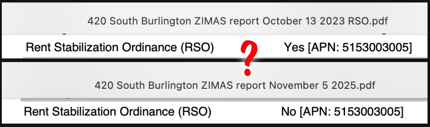 Also, the city’s ZIMAS portal now shows the Burlington Hotel as not being subject to the rent stabilization ordinance, a change from the status the portal reported in October 2023, when this newsletter was published. If a City staffer logged in and changed the status, they left no explanation for why they might have done so.