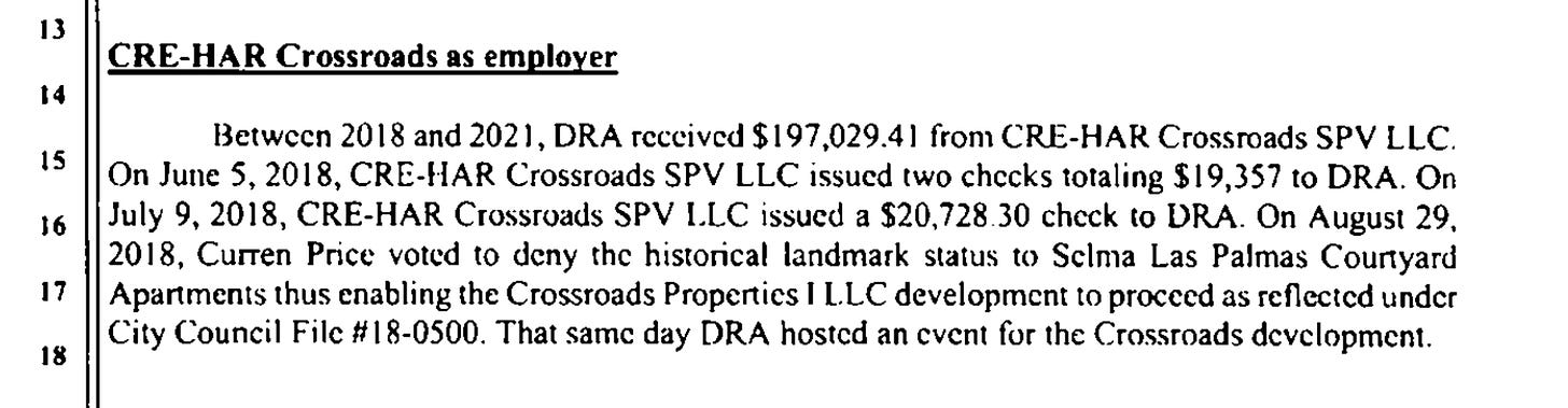 On page 69, the people explicitly allege that the councilmember’s wife Del Richardson’s company received nearly $200,000 from Harridge, ostensibly for her services urging inconvenient tenants to vacate their units, and that she hosted an event for the Crossroads project on the very day Price voted to oppose landmarking the apartments in which he had a financial interest.