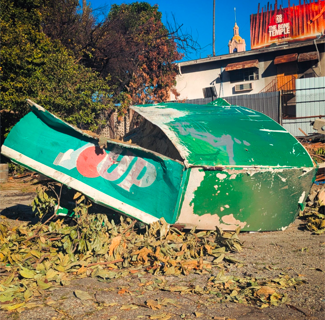 This is what LAFD’s backhoe did to Hollywood Center Motel’s iconic 7-Up machine when the protected El Nido was wrongly demolished while under landmark protection on a rainy Sunday morning.