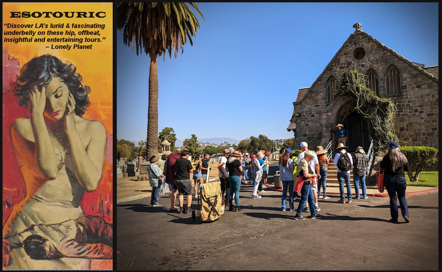 Our work—leading tours and historic preservation and cultural landmark advocacy—is about building a bridge between Los Angeles’ past and its future, and not allowing the corrupt, greedy, inept and misguided players who hold present power to destroy the city’s soul and body. If you’d like to support our efforts to be the voice of places worth preserving, we have a tip jar, vintage Los Angeles webinars available to stream, in-person tours and a souvenir shop you can browse in. We’ve also got recommended reading bookshelves on Amazon and the Bookshop indie bookstore site. And did you know we offer private versions of our walking tours for groups big or small? Or just share this link with other people who care.