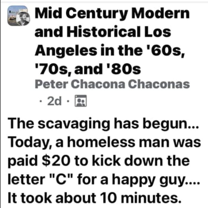 It started with the “C” in the Hollywood Center Motel signage on the breeze block wall. Someone who claims to have witnessed it posted to a Facebook group (that has blocked us from viewing its content) about “a happy guy” paying a homeless person to kick it down. A concerned citizen shared this information.