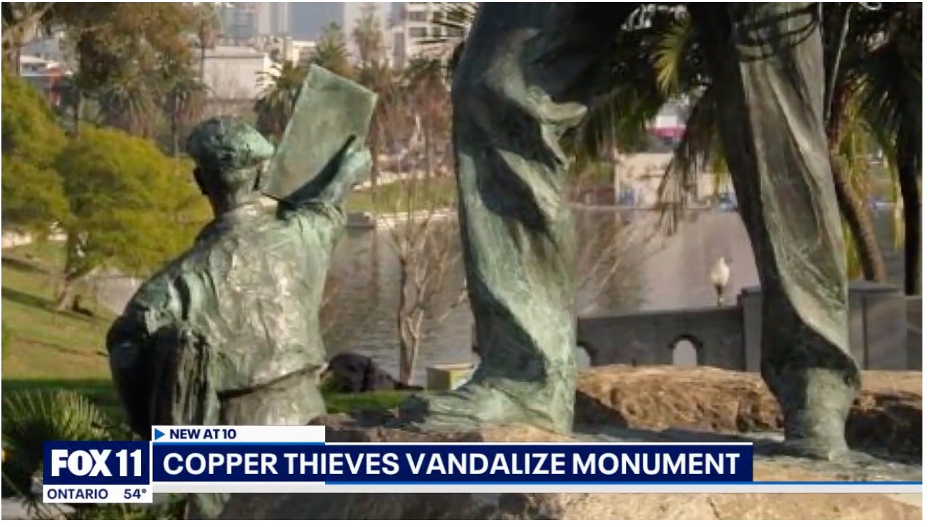 For everything that is will be lost in time, and it is a privilege to be alive and aware and able to mourn when something loved flickers out forever—in this case, presumably pried off the stone with a crowbar and tossed into the back of a truck to be melted down for its minuscule scrap value by a crooked dealer empowered by LAPD’s refusal to enforce state and local laws overseeing recycling yards.