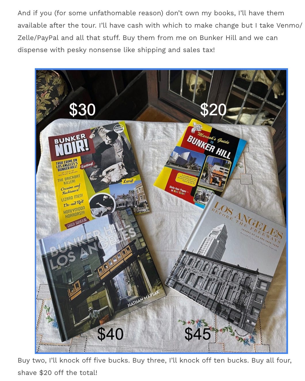 Our work—leading tours and historic preservation and cultural landmark advocacy—is about building a bridge between Los Angeles’ past and its future, and not allowing the corrupt, greedy, inept and misguided players who hold present power to destroy the city’s soul and body. If you’d like to support our efforts to be the voice of places worth preserving, we have a tip jar, vintage Los Angeles webinars available to stream, in-person tours and a souvenir shop you can browse in. We’ve also got recommended reading bookshelves on Amazon and the Bookshop indie bookstore site. And did you know we offer private versions of our walking tours for groups big or small? Or just share this link with other people who care.
