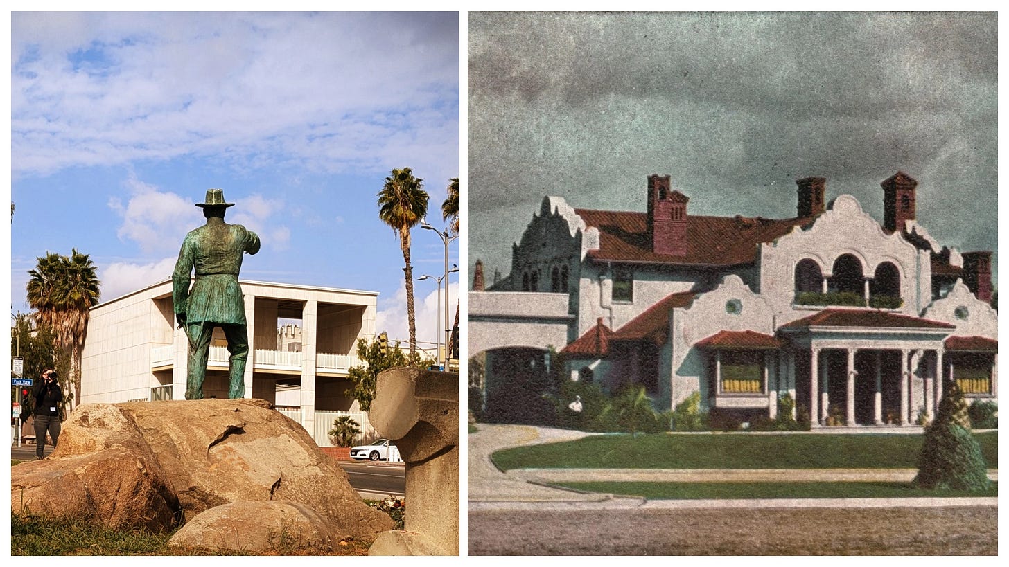 We loved the fairy-like figures on the metal globe plaque attached to the rock on which the statue of Los Angeles Times publisher Harrison Gray Otis (1837–1917) still stands, pointing across Wilshire towards the Otis Art Institute campus which replaced his longtime home, the Bivouac.