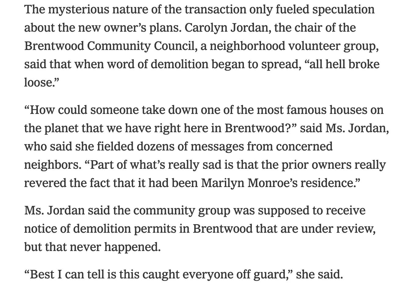 In The New York Times on 9/13/2023, Carolyn Jordan of the Brentwood Community Council said her organization did not receive the legally required notice from LADBS and everyone was flipping out about it. (Parenthetically, BCC would later submit a letter opposing landmark status, and Jordan’s law firm Glaser Weil soon got a new client: the property owners seeking their demolition permit.)