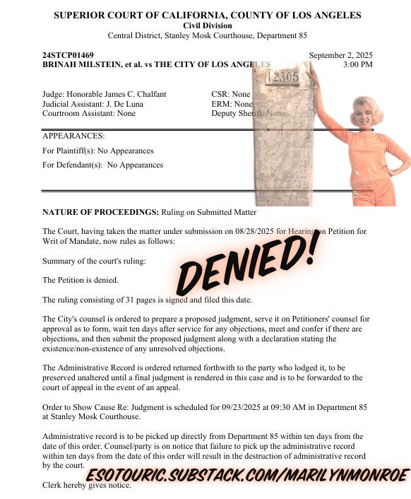 Update 9/23/2025: Judge Chalfant has made his decision and it is to DENY the petition for writ of mandate. That means that Marilyn Monroe’s house at 12305 5th Helena Dr. remains a protected Historic Cultural Monument of the City of Los Angeles. The full 31 page ruling is not yet available, but the decision appears below.