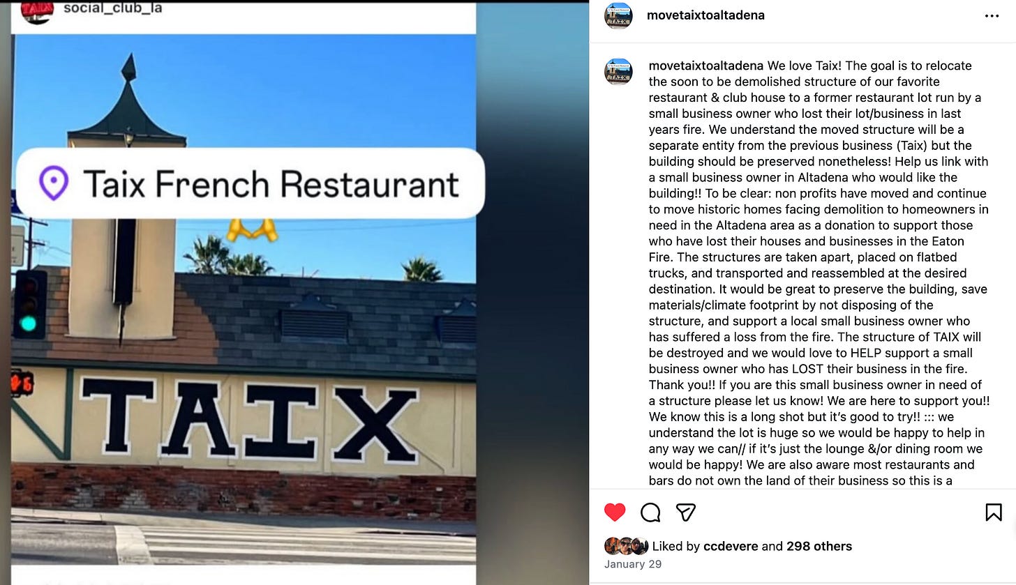 Taix is still here into March. Please visit, make memories, tip well, think good thoughts. And if you happen to have a vacant lot on Lake or another main drag in the Eaton Fire scar, try making nice with the hothead who runs the taixfrench Instagram handle. Maybe you can make a deal that soothes a lot of broken hearts!