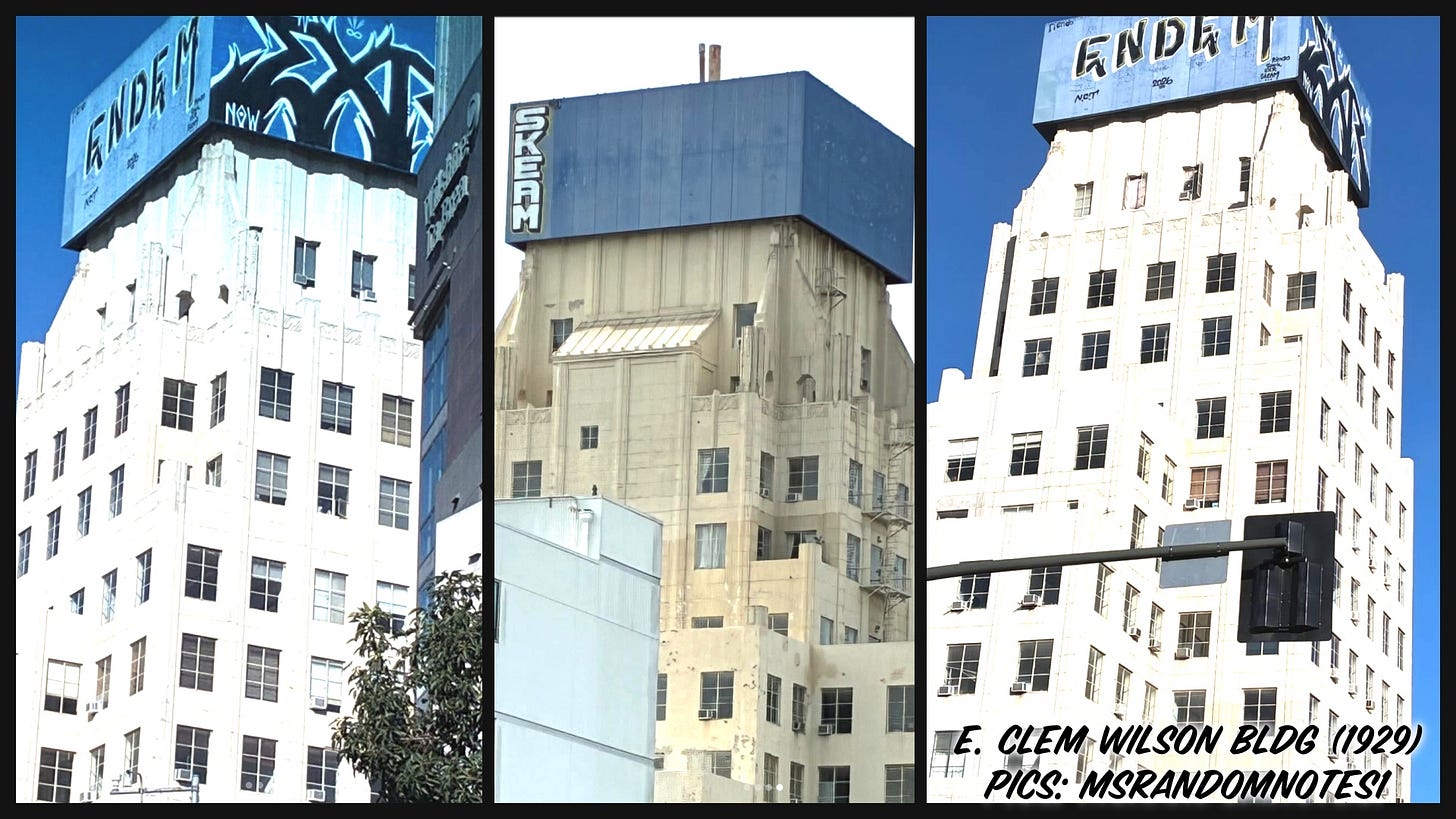 Preservation pal msrandomnotes1 sounds the alarm about serious tagging on the mostly empty E. Clem Wilson Building (Meyer & Holler, 1929) at Wilshire and La Brea. The owner who opposed landmarking efforts needs to secure the tower, clean it up!