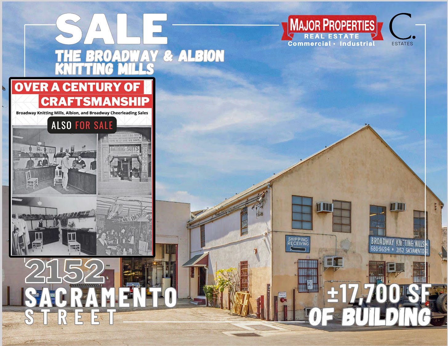 Three iconic L.A. fashion businesses—Broadway and Albion Knitting Mills and Broadway Cheerleading Sales—and their historic HQ at 2152 Sacramento have just been listed. If they don’t sell as a package, where will American teams buy cheer uniforms and varsity jackets?