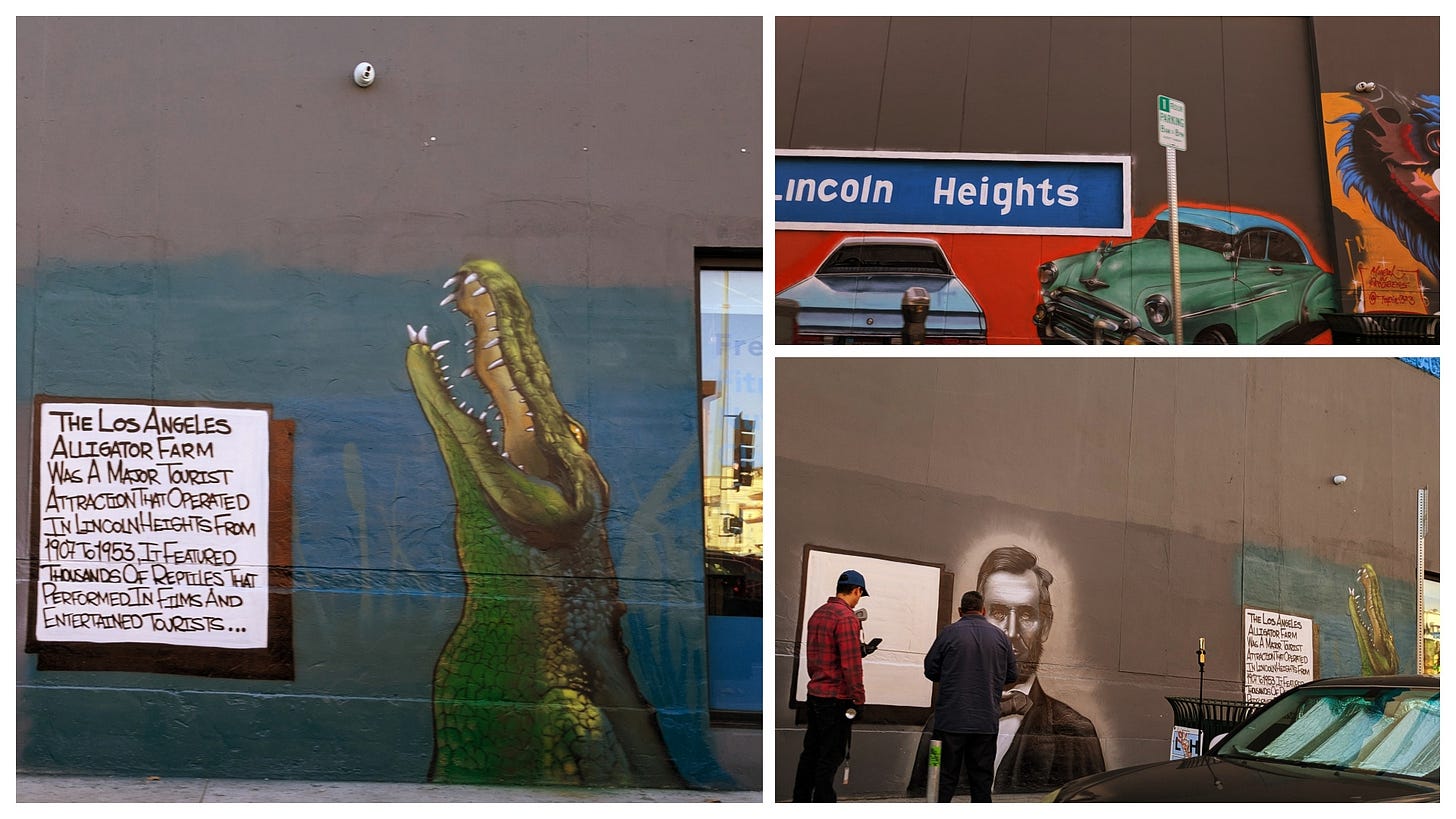 There’s a cool new neighborhood history mural from @tapia.323 going up at Daly and Broadway in Lincoln Heights, featuring low riders, Honest Abe and a snappy crocodilian representing the Lincoln Park Alligator Farm!