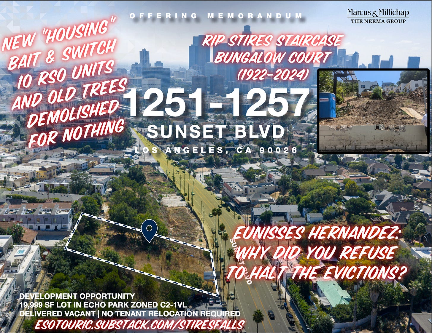Update November 4, 2025: L.A. Eyes, too, has been watching the Stires Staircase Bungalow Court debacle, and is particularly irked that there is no mechanism to enforce building the affordable units promised to justify rejected landmarking, mass eviction and demolition now that the vacant lot is on the market as a $2.5 Million flip.